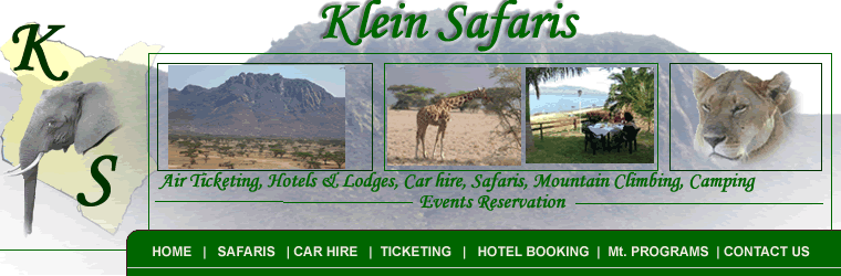 Contact Klein Safaris Mountain Programs, Mount Kenya Climbing, Mount Kilimanjaro climbing Hotel bookings in kenya, Accommodation in Nairobi, Accommodation in Mombasa Flight bookings in Kenya Car rental in Kenya, Cars for Weddings, Cars for Safari, JKIA transfers Safari in kenya, Safari in Tanzania, Masai Mara, Tsavo, Serengeti, Amboseli klein Safaris